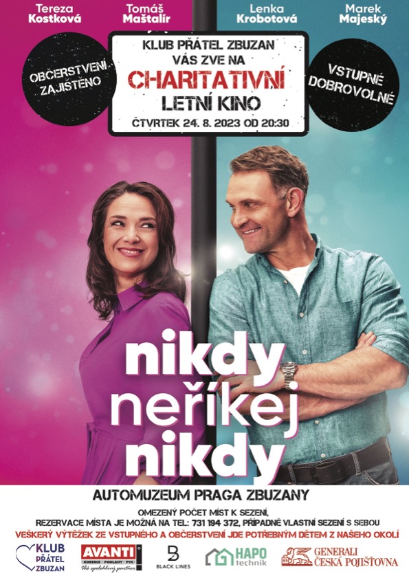 24.9.2023 jsme pořádali charitativní kino, promítali jsme premiéru filmu Nikdy neříkej nikdy. Děkujeme za tak hojnou účast a ještě jednou děkujeme sponzorům a majitelům areálu Praga, bez kterých bychom tuto akci zrealizovat nemohli. Již teď se těšíme zase za rok :-)